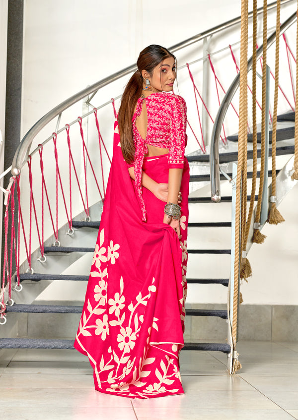 KESHARIYA PURE MULMUL COTTON FLORAL BLOCK PRINTED PINK SAREE KESHARIYA PURE MULMUL COTTON FLORAL BLOCK PRINTED PINK SAREE