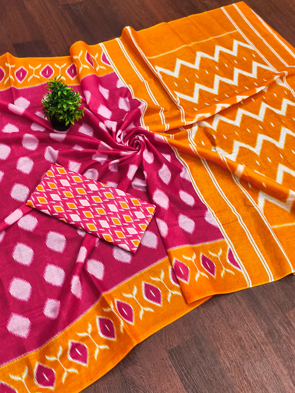 SAREES : *6.30 MTR PURE MULMUL COTTON IKKAT HAND PRINT SAREES WITH BLOUSE PICE*