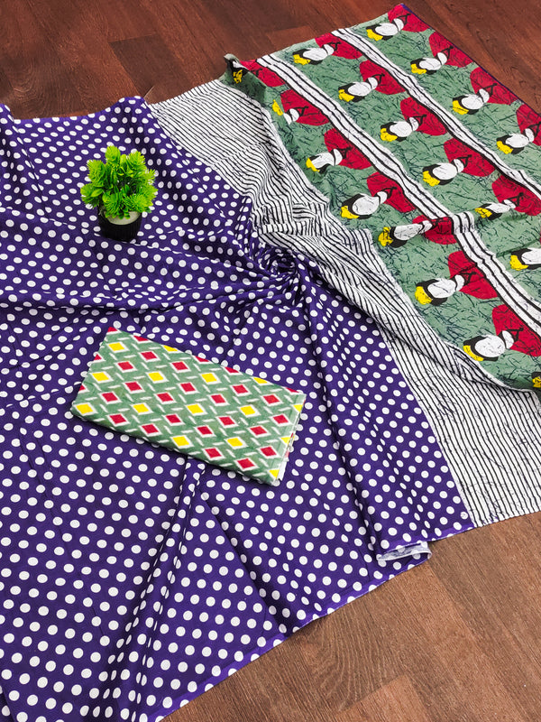 POLKA DOTS INDIAN STYLE PRINTD MULMUL COTTON BLUE SAREE POLKA DOTS INDIAN STYLE PRINTD MULMUL COTTON BLUE SAREE