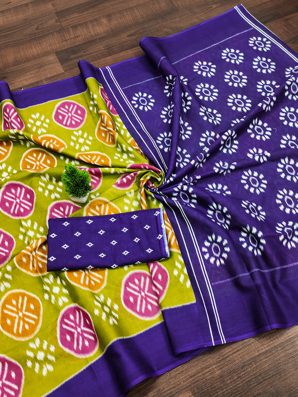 FABRICS  : MULMUL COTTON SAREES   : 5.50 MTR APPROX PURE MULMUL COTTON IKKAT HAND PRINTED SAREES BLOUSE : 0.80 MTR APPROX RUNING PURE COTTON SEM AS PHOTO BLOUSE PICE COLOR : OLIVE GREEN SINGLE PCS ...