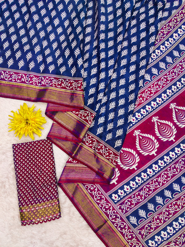 BASANTI PRIMUM PURE COTTON MULMUL BUTI HAND BLOCK PRINT WITH HEVAY ZARI BODAR BLUE SAREE BASANTI PRIMUM PURE COTTON MULMUL BUTI HAND BLOCK PRINT WITH HEVAY ZARI BODAR BLUE SAREE