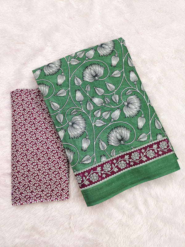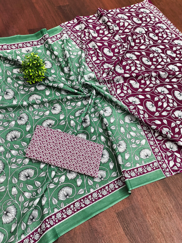 FLORAL HAND BLOCK STYLE PRINT MULMUL COTTON GREEN SAREE FLORAL HAND BLOCK STYLE PRINT MULMUL COTTON GREEN SAREE