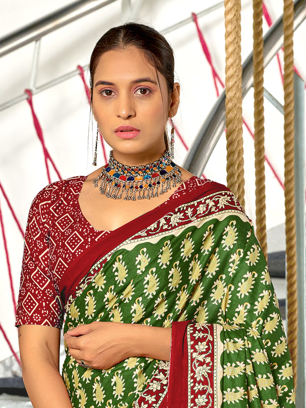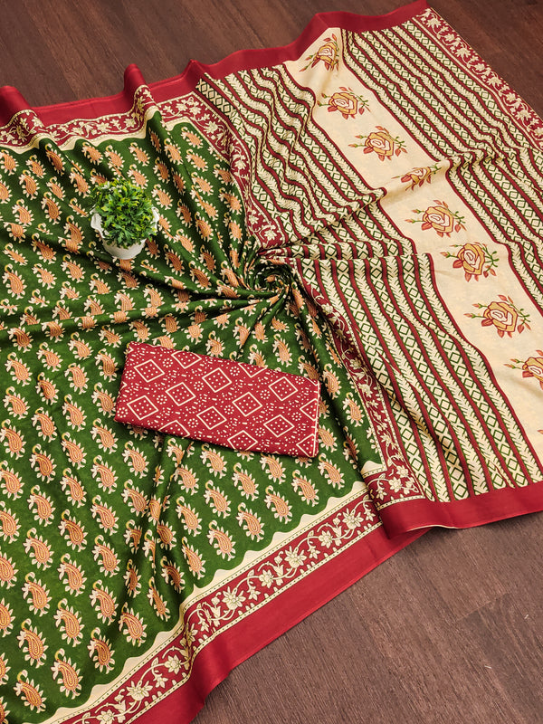 INAYAT PURE MULMUL COTTON JAIPUR PRINTD GREEN SAREE