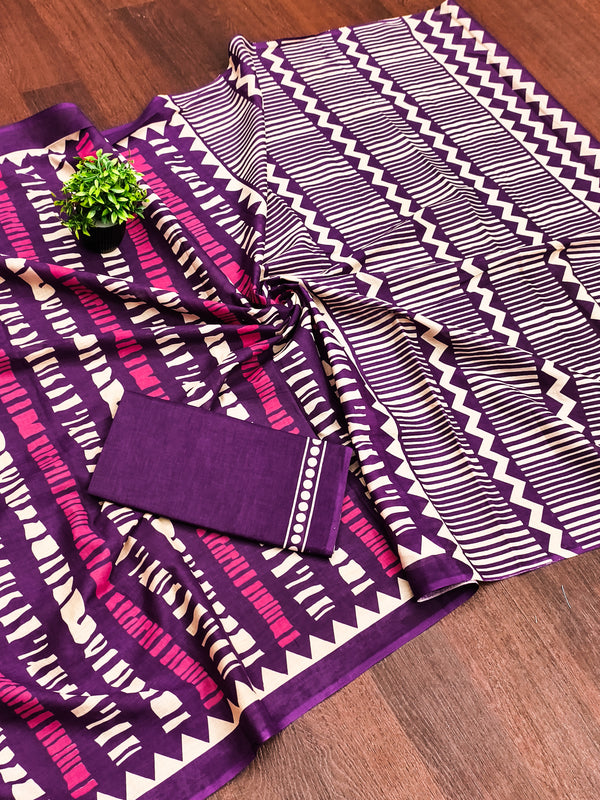FABRICS  : MULMUL COTTON SAREES   : *6.30 MTR PURE COTTON FANCY BAGRU BLOCK PRINT SAREES WITH BLOUSE PICE* COLOR : PURPLE SINGLE PCS READY