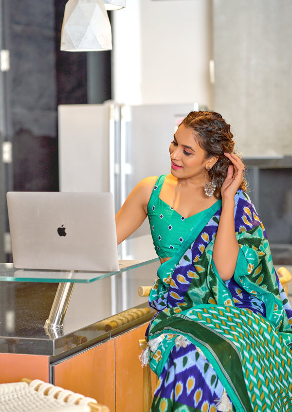 MAHARANI PURE MULMUL COTTON IKKAT PRINTD GREEN AND BLUE SAREE MAHARANI PURE MULMUL COTTON IKKAT PRINTD GREEN AND BLUE SAREE