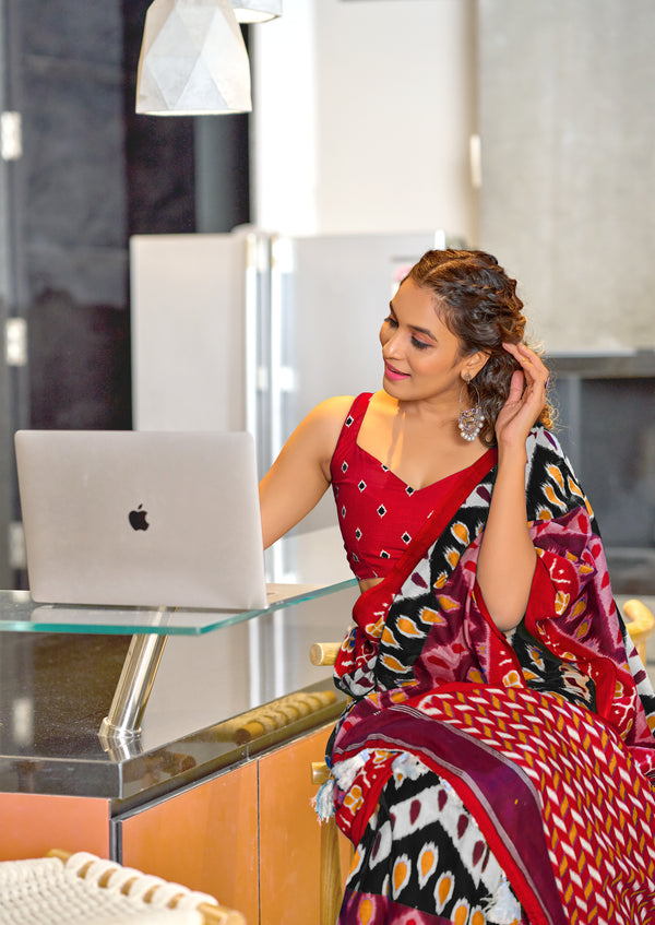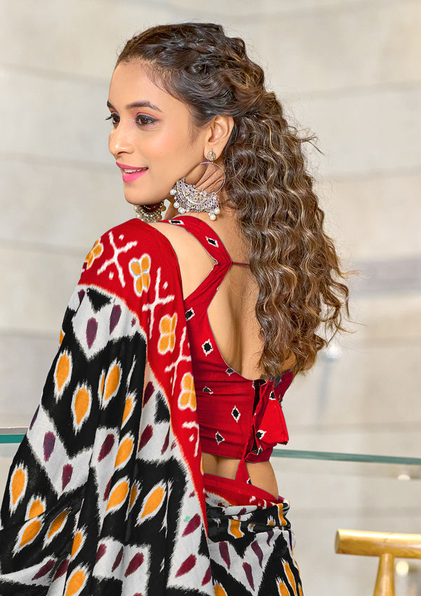 MAHARANI PURE MULMUL COTTON IKKAT PRINTD RED AND BLACK SAREE
