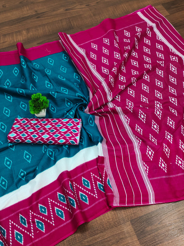 PREMWATHI PURE MULMUL COTTON IKKAT POCHAMPALLY HAND PRINTED TEAL BLUE SAREE PREMWATHI PURE MULMUL COTTON IKKAT POCHAMPALLY HAND PRINTED TEAL BLUE SAREE