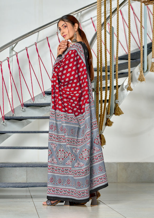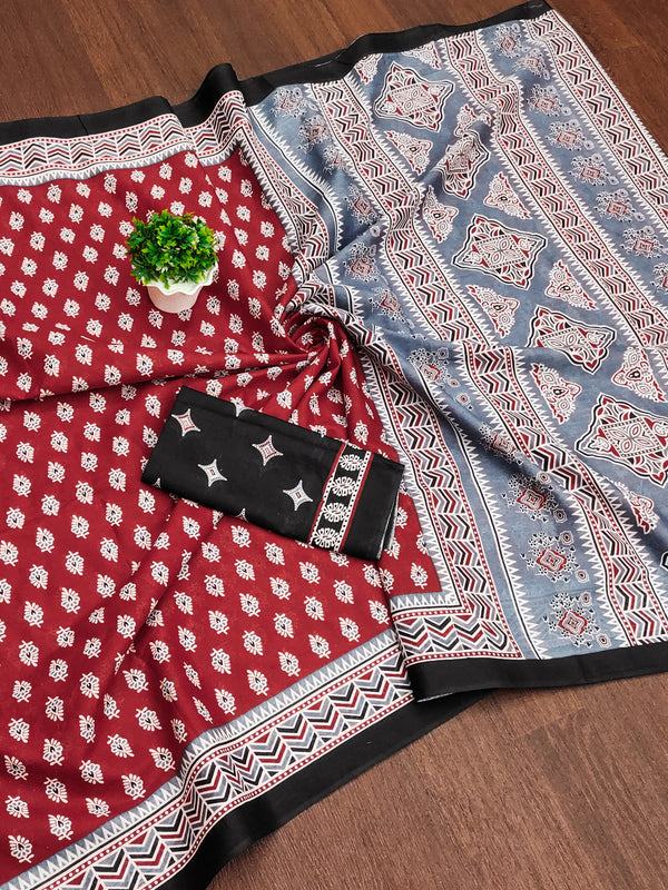 RACHITA PURE MULMUL COTTON BAGRU PRINTD MAROON SAREE RACHITA PURE MULMUL COTTON BAGRU PRINTD MAROON SAREE