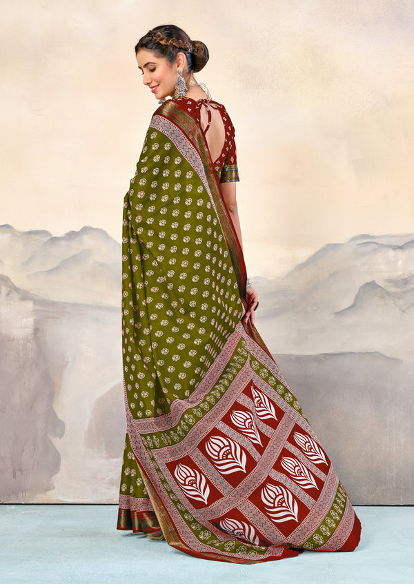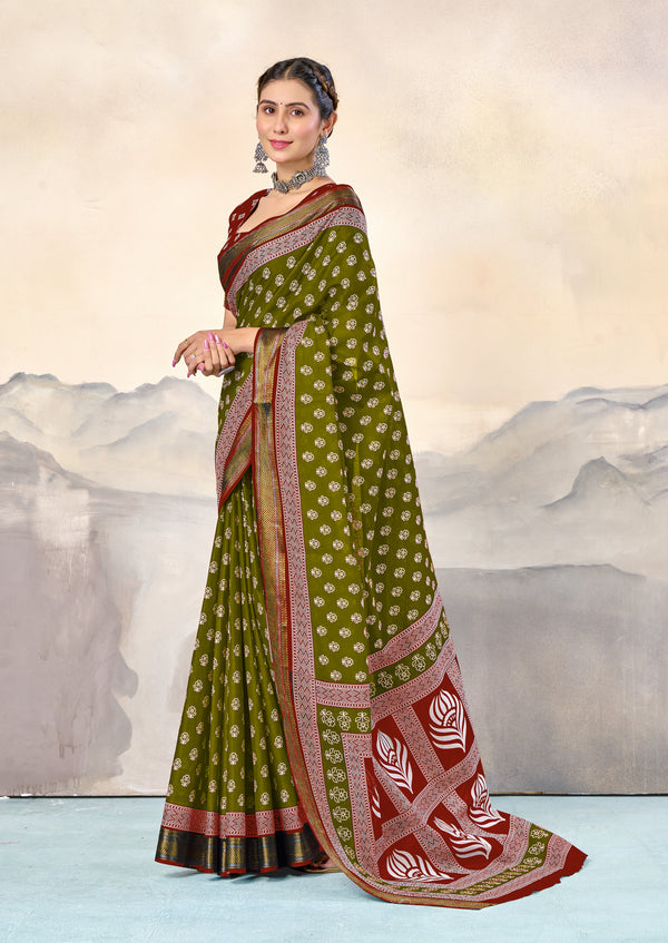 RASHMI PURE MULMUL HAND BLOCK PRINT WITH HEVAY ZARI BODAR GREEN AND RED SAREE RASHMI PURE MULMUL HAND BLOCK PRINT WITH HEVAY ZARI BODAR GREEN AND RED SAREE