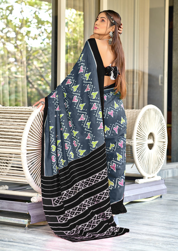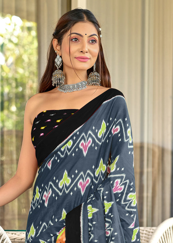 RASHMIKA PURE MULMUL COTTON IKKAT PRINTD GREY SAREE