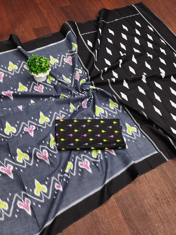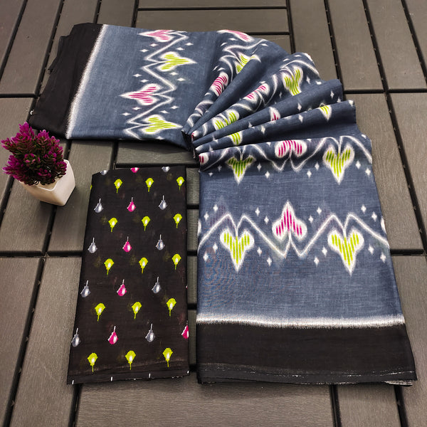 FABRICS  : MULMUL COTTON SAREES   : 5.50 MTR APPROX PURE MULMUL COTTON IKKAT  PRINTD SAREES BLOUSE : 0.80 MTR APPROX RUNING PURE COTTON SEM AS PHOTO BLOUSE PICE COLOR : GREY SINGLE PCS READY