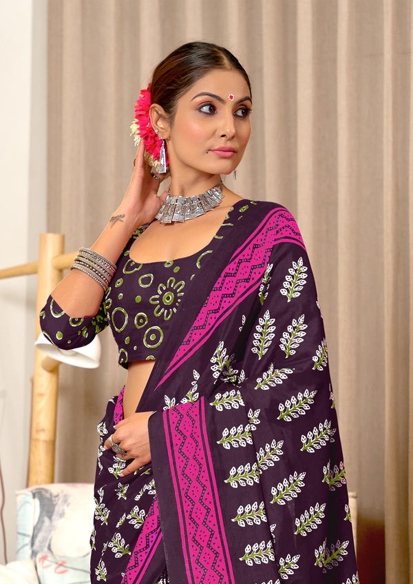 SITARA PURE MULMUL COTTON HAND BLOCK PRINTD BROWN SAREE