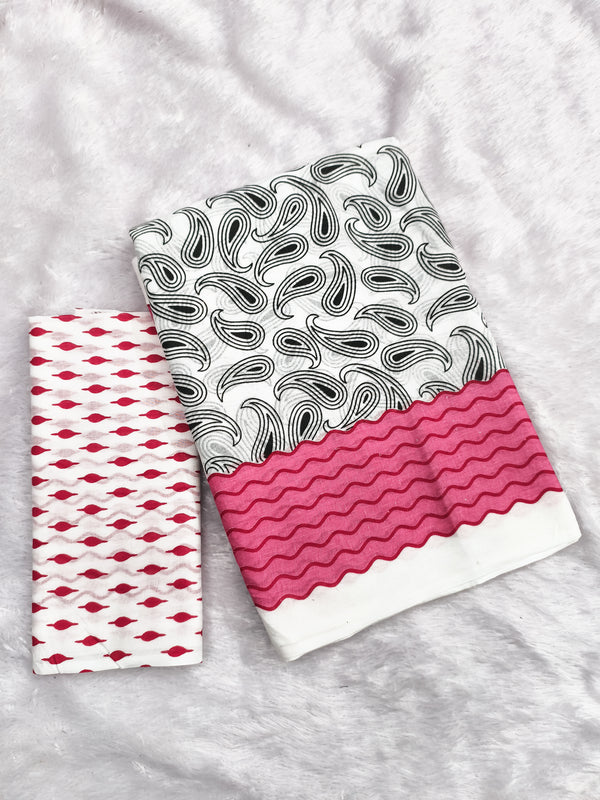SAREES : 5.50 MTR APPROX PURE MULMUL COTTON WHITE AND PINK SUMMAR HAND BLOCK PRINT SAREES