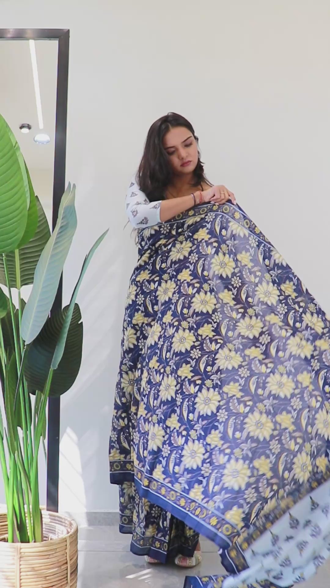 100% PURE MULMUL COTTON BLUE AND WHITE SAREE 5.5MTR APPROX AJRAKH PRINTED SAREES WITH 0.80MTR APPROX BLOCK PRINTED BLOUSE PICE